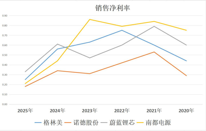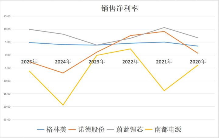 盈利能力:蔚蓝锂芯>格林美>诺德股份>南都电源