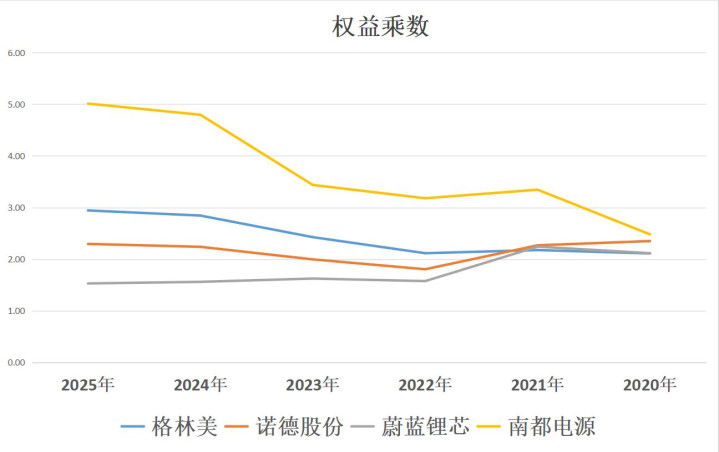 权益乘数:南都电源>格林美>诺德股份>蔚蓝锂芯